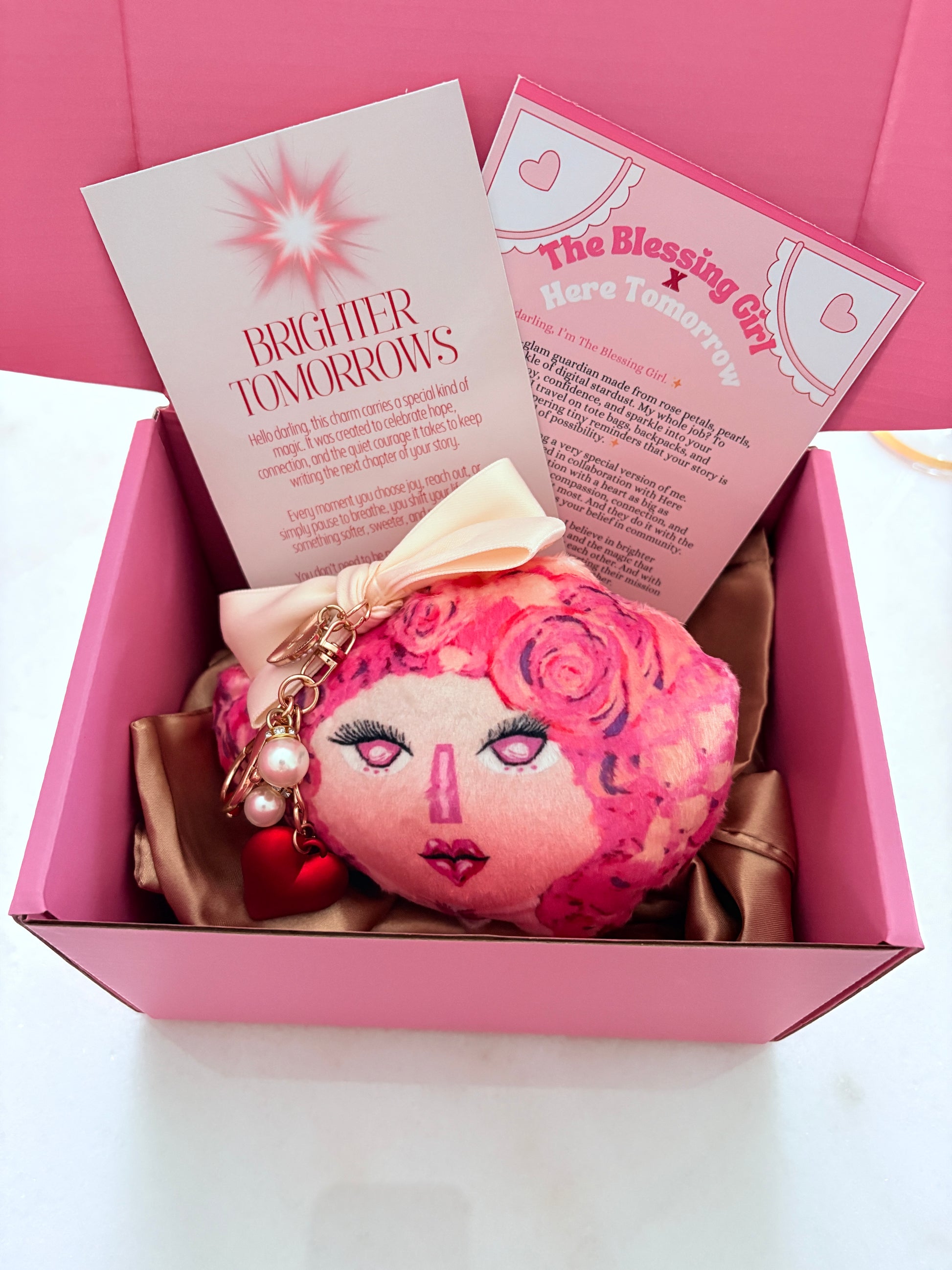 💌 What's Included – each pink gift box  includes a Blessing Girl bag charm with a "blind buy" charm attached (part of the fun is the surprise charm attached!), a gold or pink satin travel bag, and a Brighter Tomorrows ritual and affirmation card.